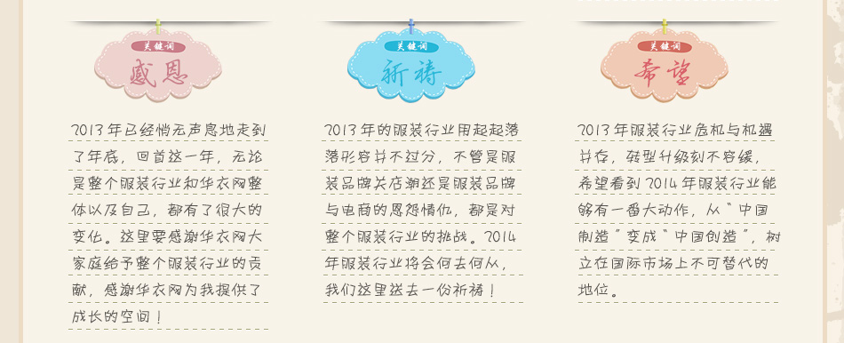 | 服裝媒體是服裝行業(yè)中必不可少的組成部分,也是整個(gè)服裝行業(yè)必不可少的公眾力量。華衣網(wǎng)作為服裝行業(yè)第一網(wǎng)絡(luò)傳媒,在此為2014年服裝行業(yè)送上我們的祝福! |